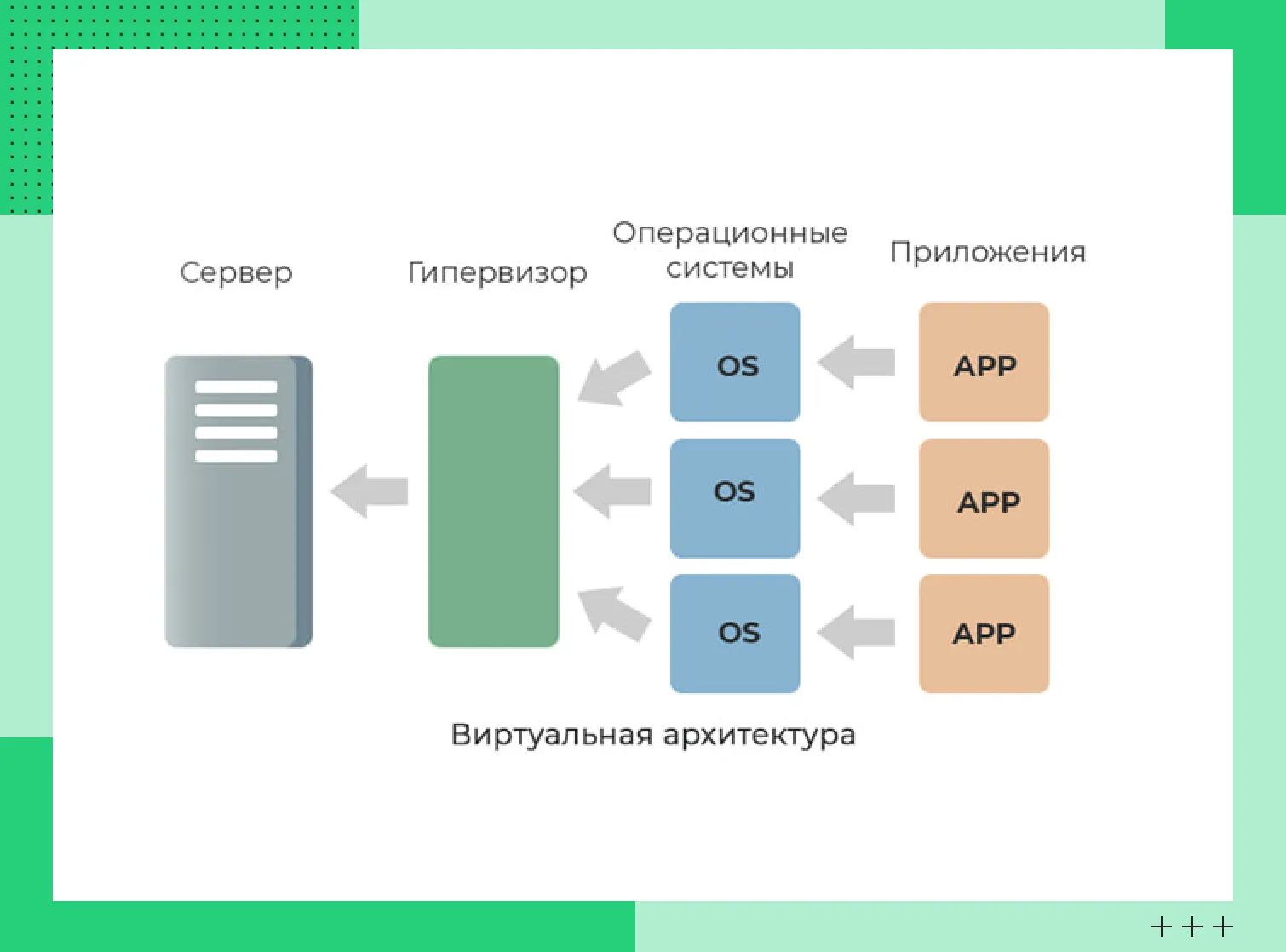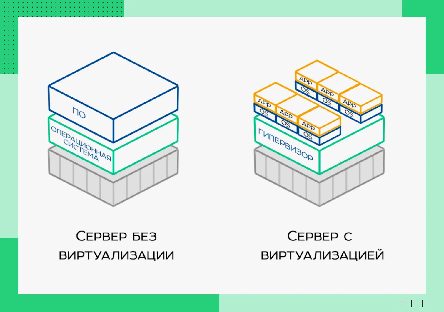 Это технология, которая позволяет запускать несколько виртуальных серверов на одном мощном физическом. В этом помогает гипервизор. Он обеспечивает изоляцию виртуальных машин друг от друга и распределяет вычислительные мощности, ресурсы хранилища. Гипервизор выделяет виртуальным серверам ресурсы по мере необходимости. Например, одна машина выполняет более ресурсоемкие задачи, чем другая. Гипервизор распределит нагрузку так, чтобы она получила больше мощностей.
