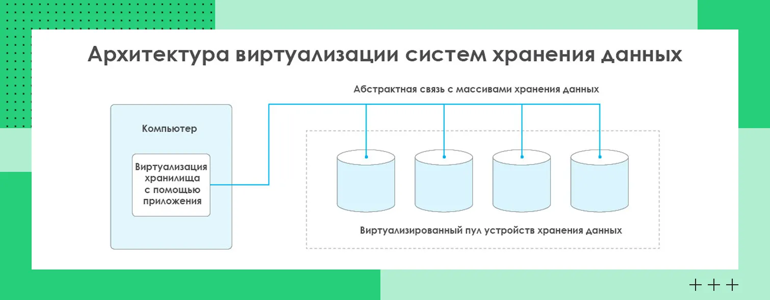 Это технология, позволяющая объединять разные системы и устройства хранения в единый пул, которым удобно управлять. ПО, обеспечивающее виртуализацию, перехватывает запросы от компьютеров или виртуальных машин и передают их соответствующему хранилищу/носителю данных. Пользователи не видят состав пула — для них виртуальное хранилище выглядит как один ресурс.