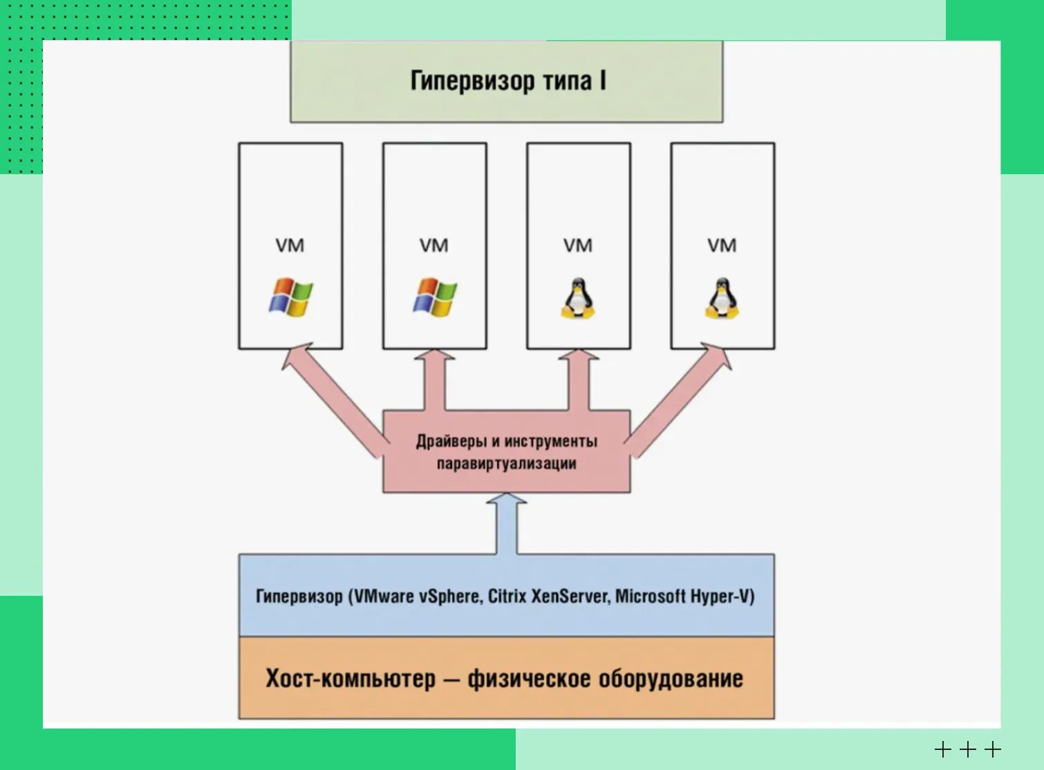 Гипервизор 1 типа | Работает напрямую на «железе» без хостовой ОС | VMware ESXi, Microsoft Hyper-V, Xen и KVM |