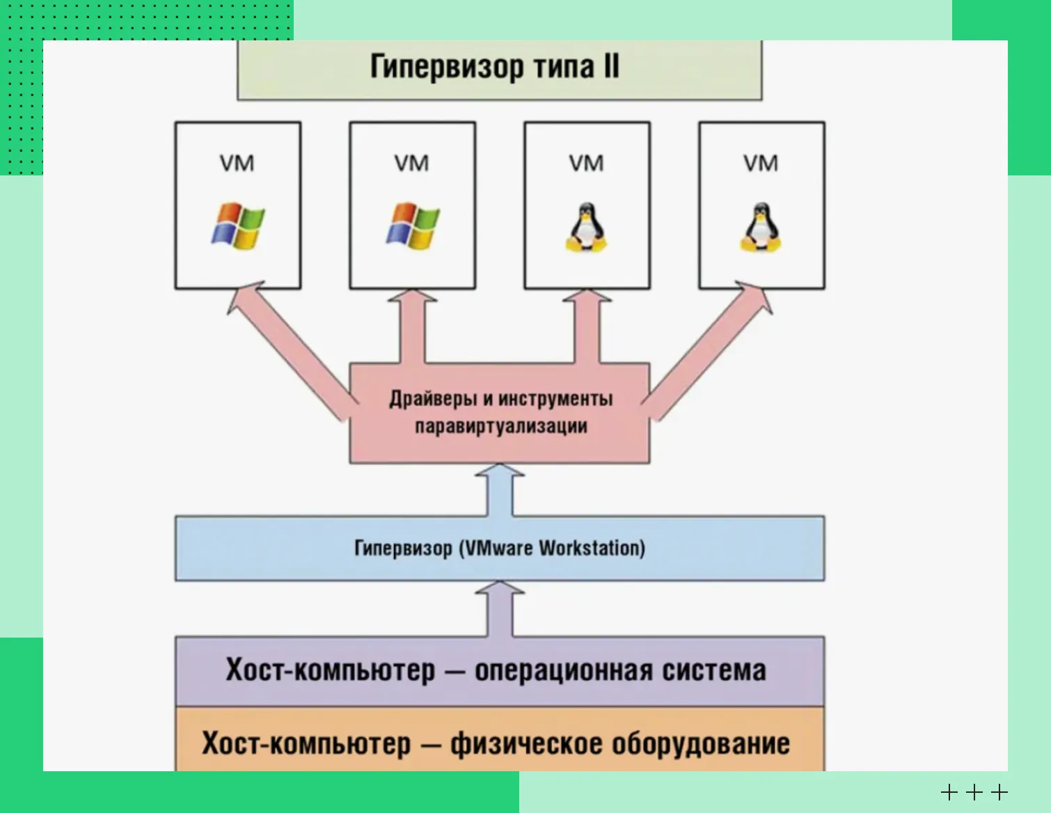 Гипервизор 2 типа | Работает поверх обычной операционной системы | VMware Workstation, VirtualBox, QEMU и Parallels Desktop |