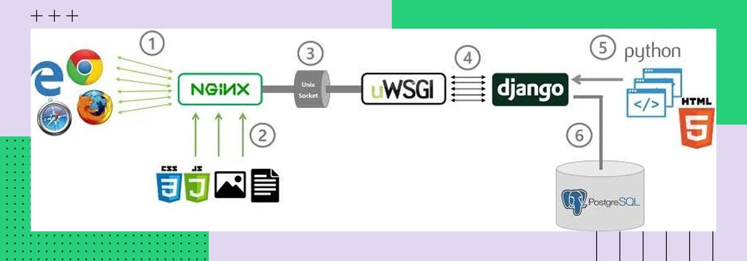 В продакшене Django обычно используется связка WSGI-сервера (например, Gunicorn или uWSGI) и веб-сервера (Nginx или Apache). WSGI-сервер запускает Python-код Django, а веб-сервер принимает HTTP-запросы, раздает статические файлы и проксирует динамические запросы к WSGI-серверу.