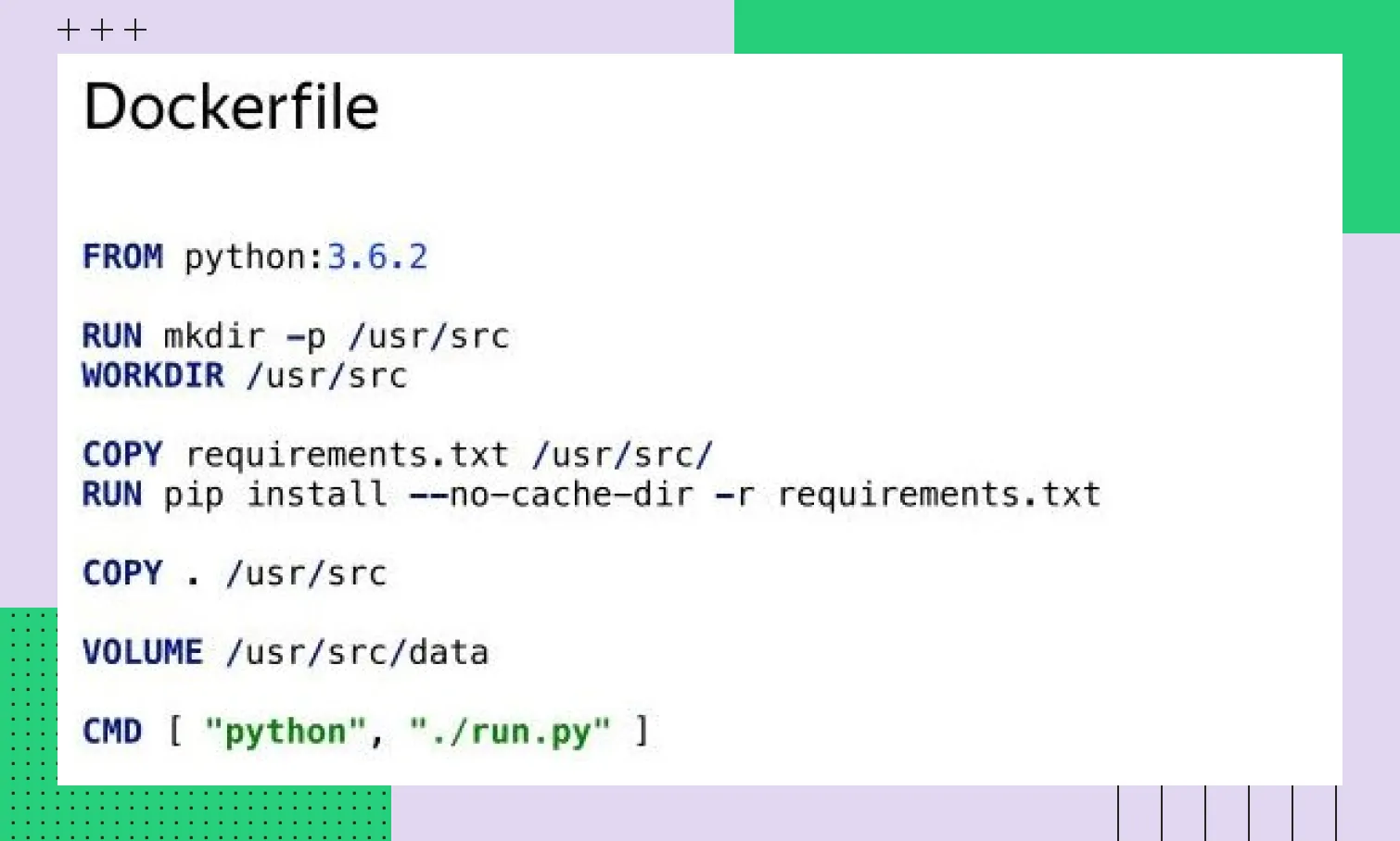 ENTRYPOINT | Задает неизменяемую команду, которая будет всегда выполняться при запуске контейнера | ENTRYPOINT ["python"] | Часто применяется вместе с CMD — инструкцией, которая передает аргументы |