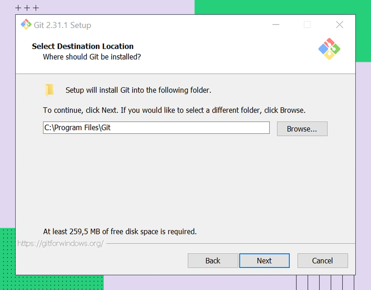 2. Выберите каталог для установки Git. Лучше оставить путь по умолчанию, поскольку он корректно прописывается в системе. Менять настройку стоит только в том случае, если предъявляются повышенные требования к безопасности.