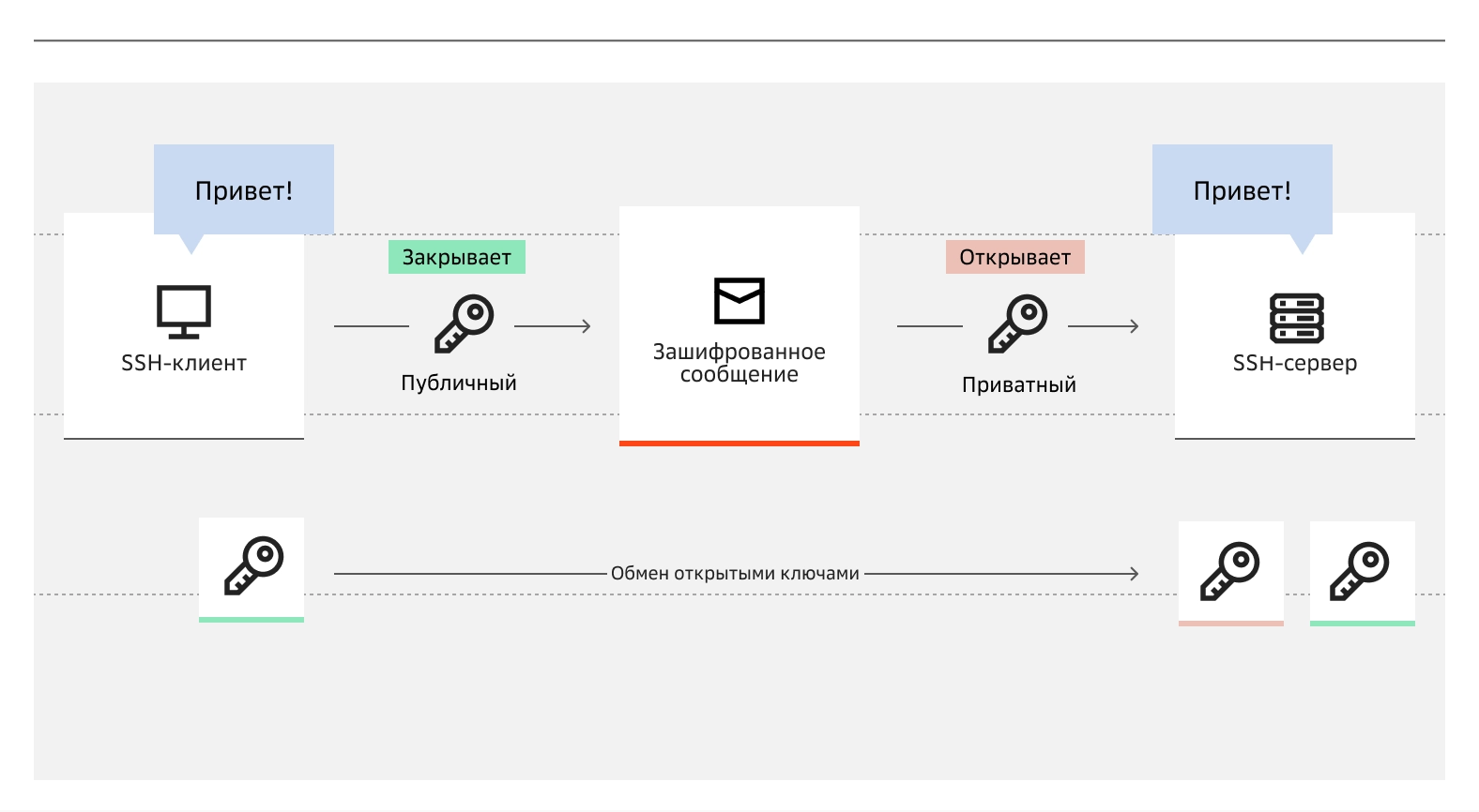 SSH использует ключи шифрования — публичный и приватный. Первый хранится на сервере, а второй есть только у клиента и никому не передается. Сервер проверяет соответствие ключей и разрешает доступ только при успешном результате.