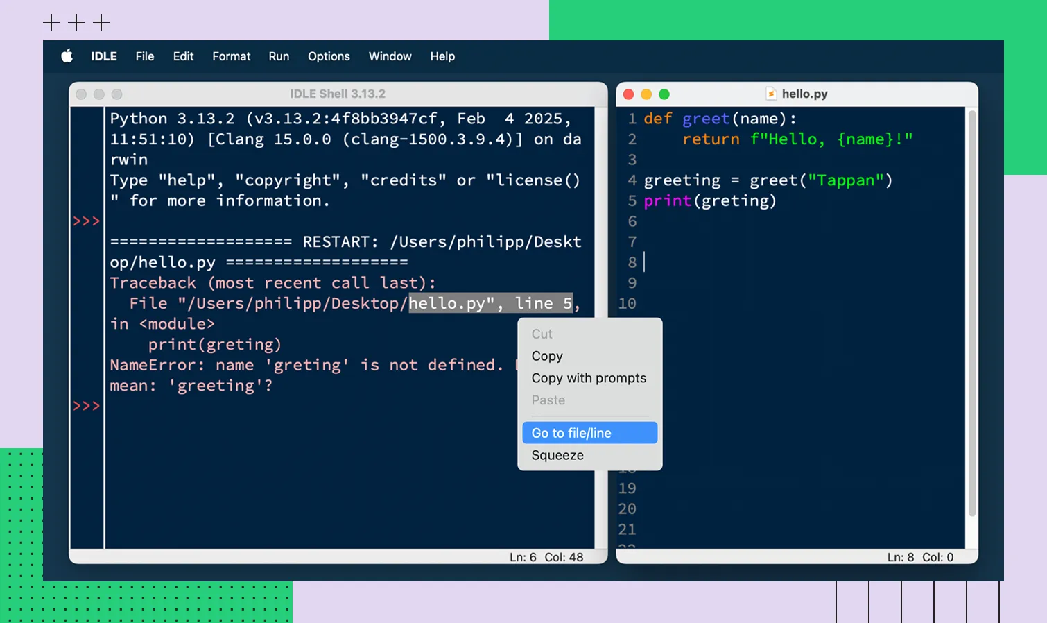 Если в коде ошибка, IDLE покажет, какая именно и где. Вы увидите номер проблемной строки, сможете вернуться в редактор и все исправить.