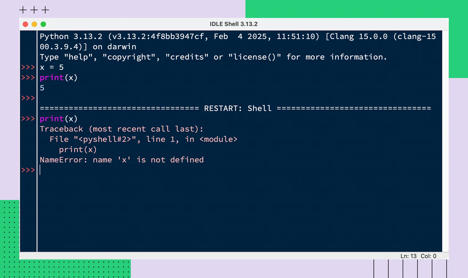 Интерактивный режим подходит для изучения синтаксиса Python, проверки отдельных выражений, тестирования фрагментов кода. Главное преимущество Shell — мгновенный вывод сообщений об ошибках с указанием места, где они произошли. Минус — действия, которые выполняются в интерактивном режиме, хранятся в рамках текущей сессии. При перезапуске переменные очищаются.
