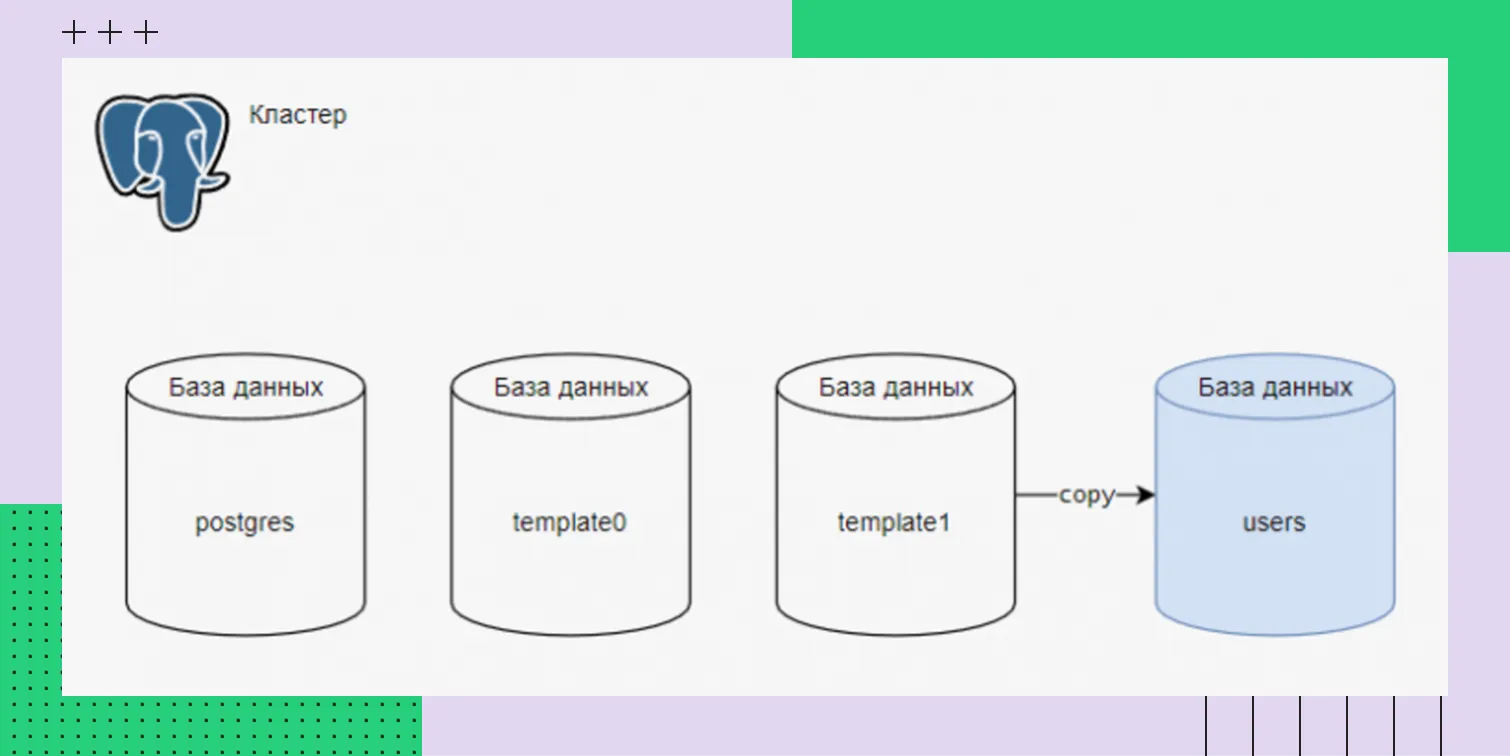 CREATE DATABASE ... TEMPLATE template0 | Создание БД из чистого шаблона | CREATE DATABASE mydb TEMPLATE template0; |