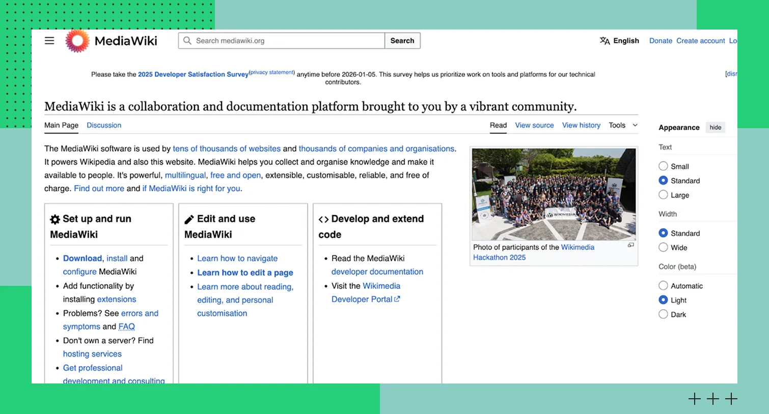MediaWiki — бесплатное открытое программное обеспечение для создания вики‑сайтов. Например, на нем построена «Википедия». Платформа работает с реляционными базами данных (например, MySQL, PostgreSQL с ограничениями или SQLite), позволяет хранить и редактировать страницы в формате вики‑текста с автоматическим сохранением истории изменений.