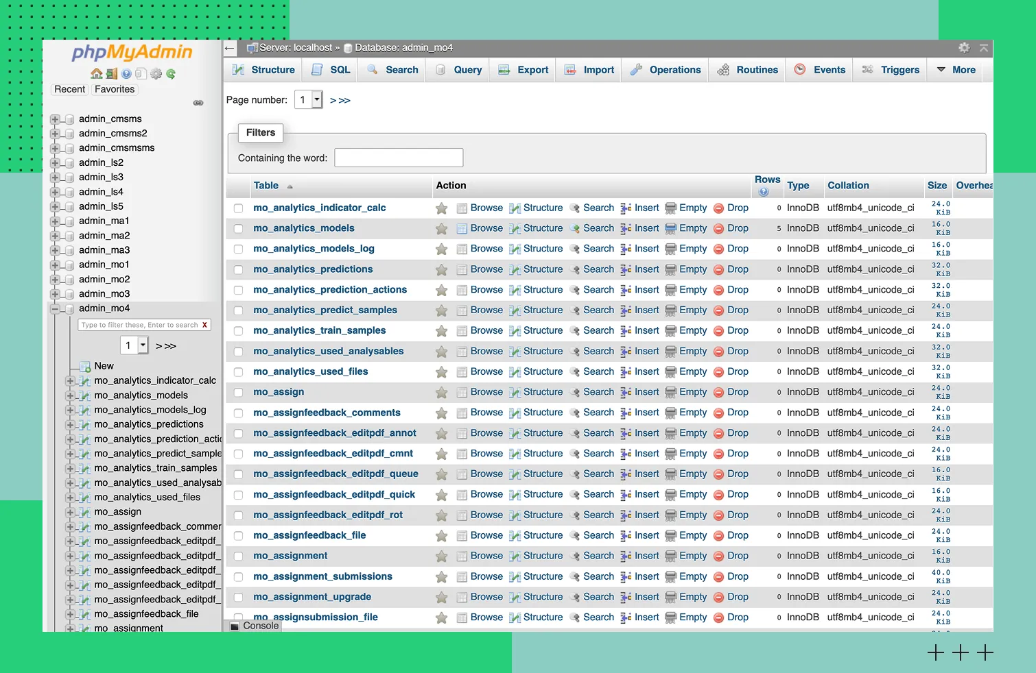Основные функции администрирования — phpMyAdmin поддерживает все операции с базами данных и таблицами, создание пользователей и настройку прав доступа.