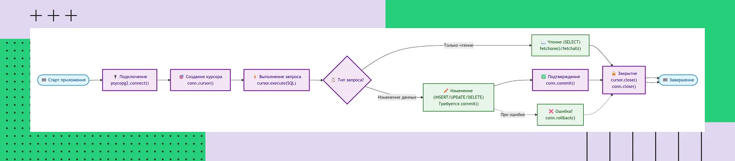При работе Python-приложений с PostgreSQL используются транзакции — последовательность операций, которые выполняются как единое целое. Либо все они завершаются успешно, либо не применяется ни одна. Задачу по выполнению транзакций облегчают встроенные механизмы управления и автоматическое сопоставление типов данных.