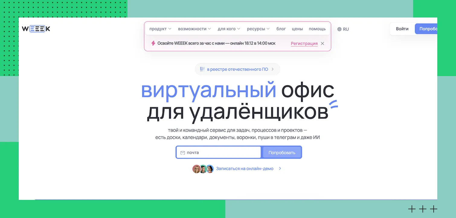 WEEEK — облачный сервис для управления задачами, проектами и командой. Он объединяет в одном рабочем пространстве таск-менеджер, CRM и корпоративную базу знаний. Платформа позволяет планировать задачи, отслеживать дедлайны, вести сделки и хранить корпоративную документацию.