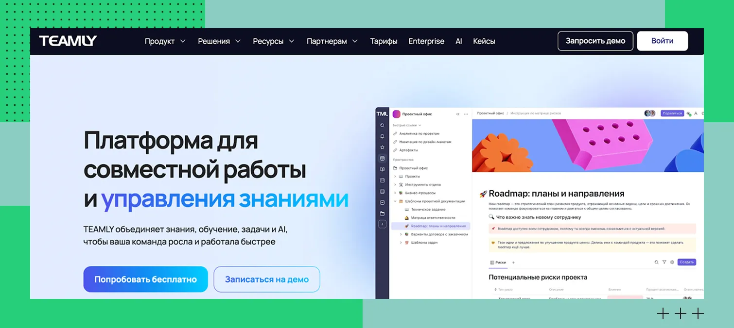 В Teamly есть база знаний с древовидной структурой, ИИ-помощник, трекер задач, обучающие курсы и «умные» таблицы. Благодаря этим функциям корпоративная информация хранится централизованно, а работать с ней совместно — легко. Что еще предоставляет платформа: