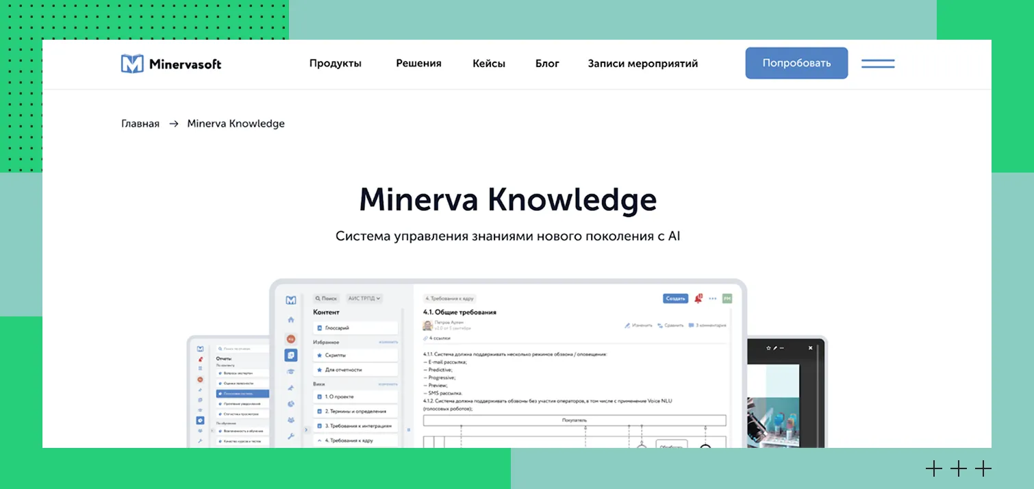 Minerva Knowledge — система управления знаниями от отечественной компании Minervasoft. Она помогает компаниям хранить, систематизировать и эффективно использовать внутреннюю информацию. Благодаря системе сотрудники будут быстрее находить ответы на вопросы, осваивать корпоративные регламенты и обучаться. Функции Minerva Knowledge: