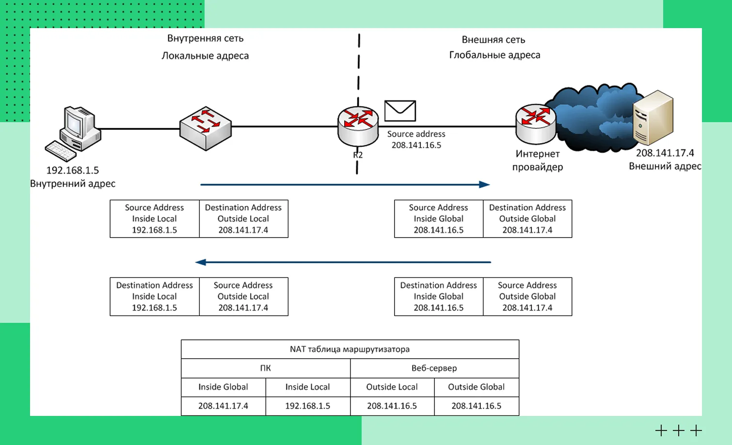 NAT обеспечивает корректную маршрутизацию трафика между сетями благодаря таблице, куда фиксируются связи между частными адресами/портами и публичными. Если отсутствует соответствующее правило преобразований, входящий пакет отклоняется.