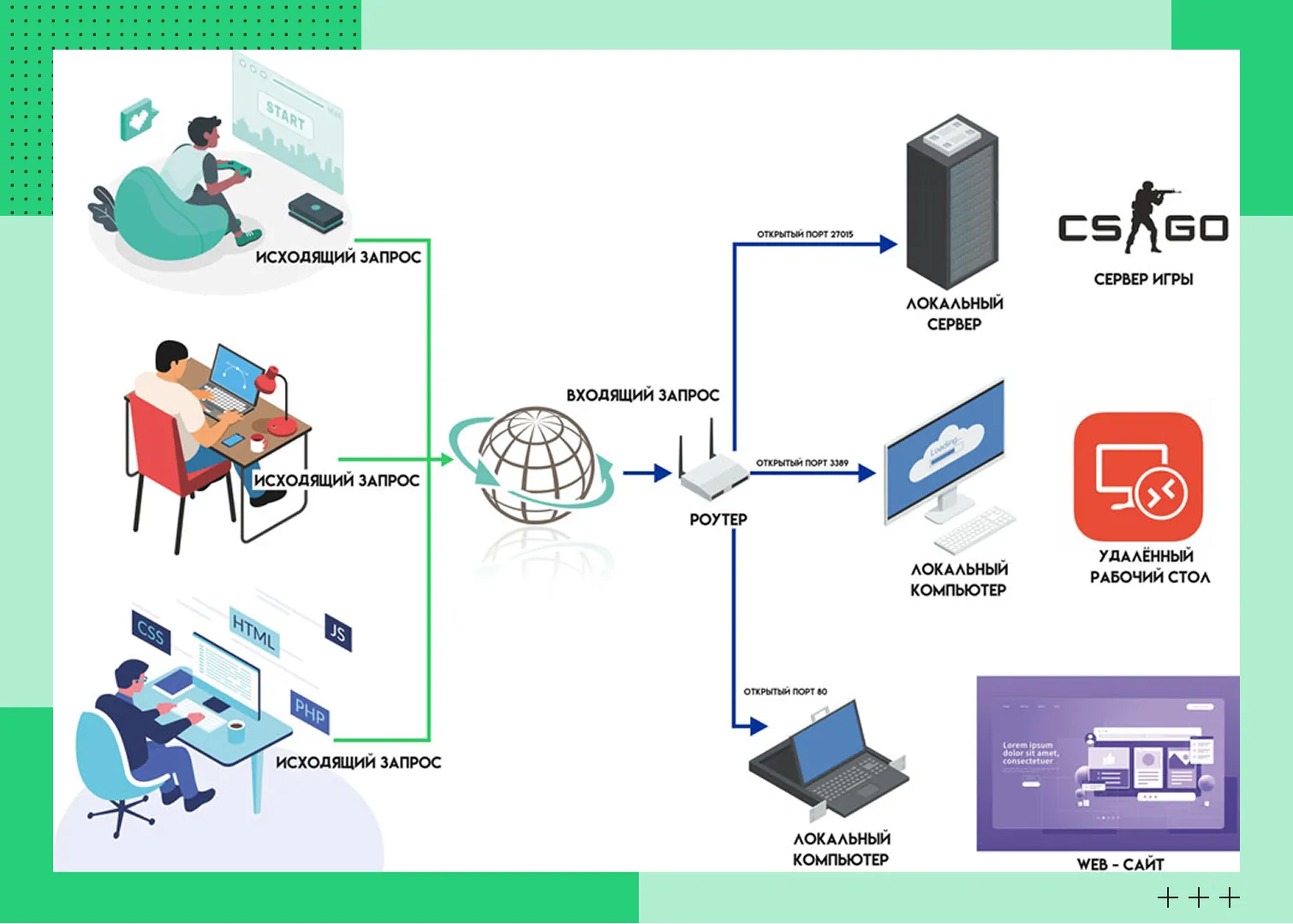 Примерно так схематически выглядит проброс портовНа примере клиент из глобальной сети подключается к публичному IP-адресу маршрутизатора 172.168.25.3 по порту 3389, который RDP использует для удаленного рабочего стола. В локальной сети есть сервер с адресом 192.168.1.100, тоже работающий на порту 3389. Согласно правилу, настроенному на маршрутизаторе, весь входящий трафик на адрес 172.168.25.3 по порту 3389 поступает к внутреннему серверу с адресом 192.168.1.100. Ответ сервера подвергается обратному действию. Маршрутизатор меняет адрес 192.168.1.100 на публичный IP 172.168.25.3 и уже с него отправляет данные клиенту.