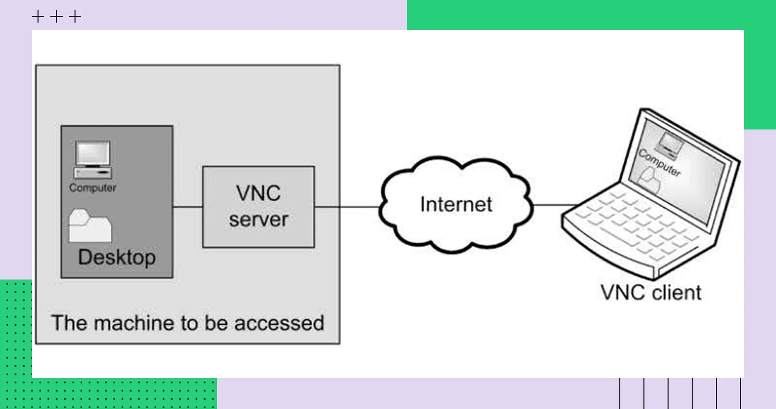 Сервер VNC захватывает изображение экрана удаленной машины, кодирует и передает на устройство клиента. Клиент отправляет обратно события ввода — движения мыши и нажатия клавиш.