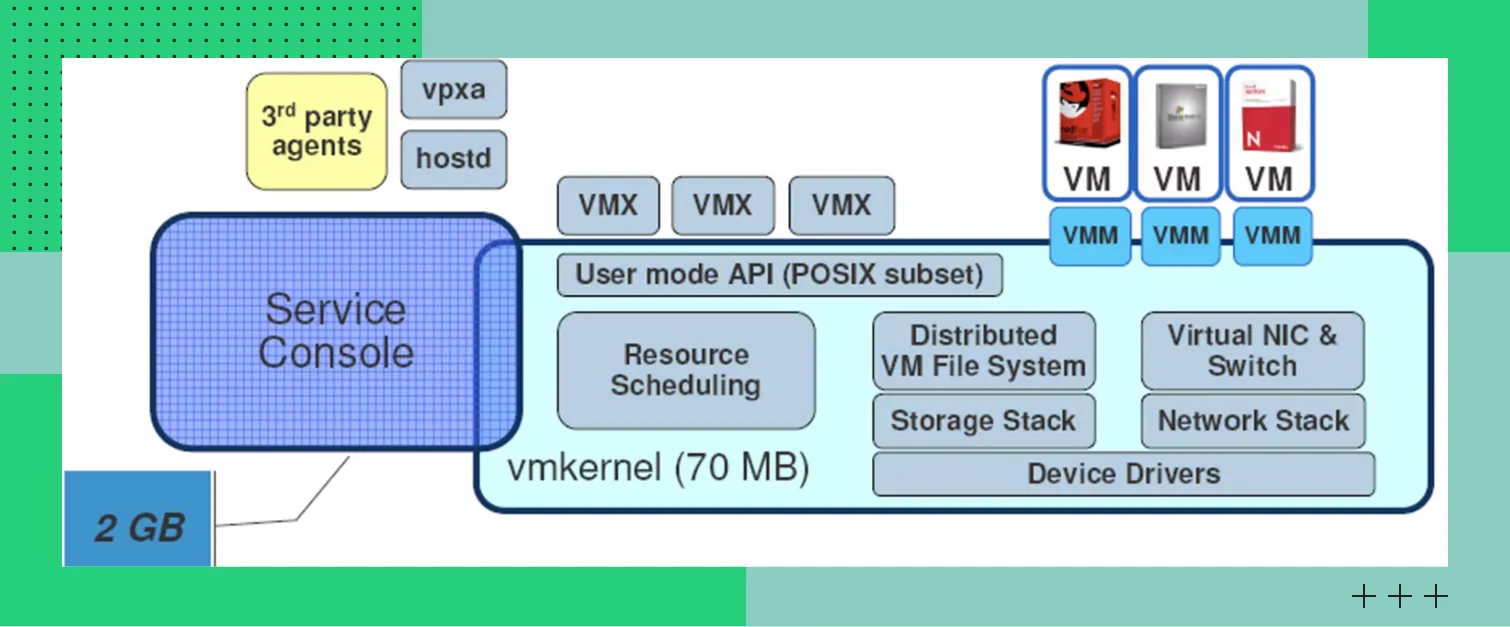 ESXi — часть платформы виртуализации vSphere, которую чаще всего используют по коммерческой лицензии. Помимо ESXi, она включает программное обеспечение для управления гипервизорами, серверами, хранилищами и сетями внутри виртуальной инфраструктуры.