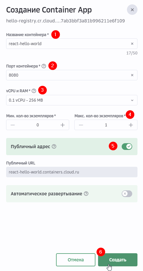 Название контейнера — глобально уникальное имя, на базе которого формируется адрес вашего приложения в домене *.containerapps.ru.