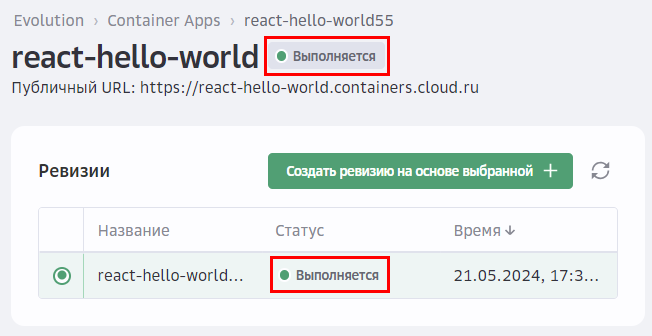 Контейнер будет запущен в течение нескольких секунд. Дождитесь, когда контейнер и ревизия перейдут в статус «Выполняется».