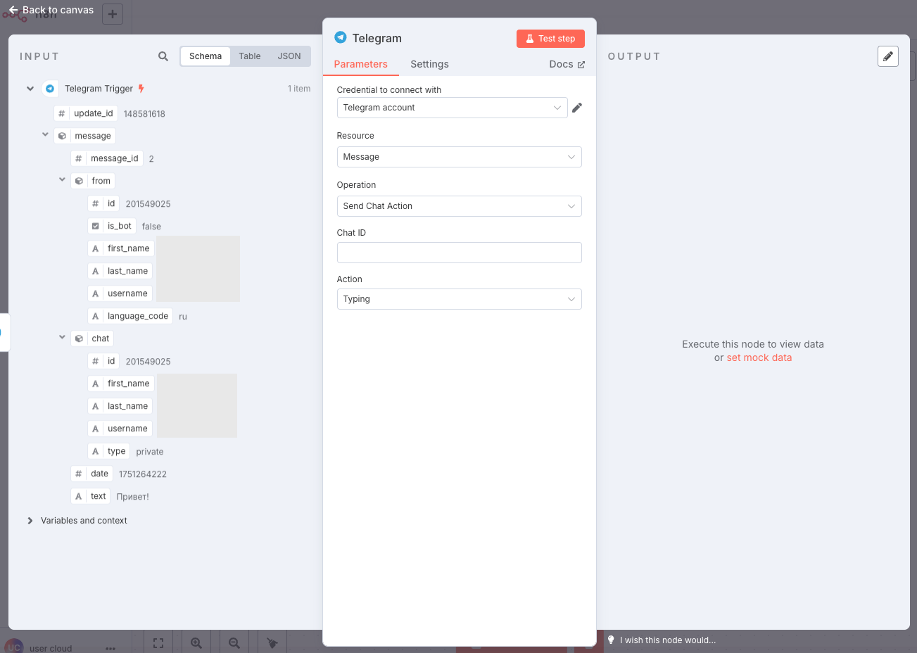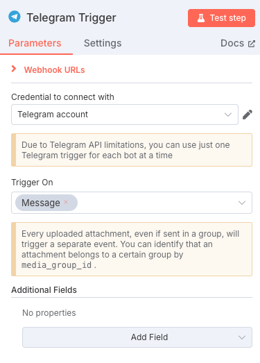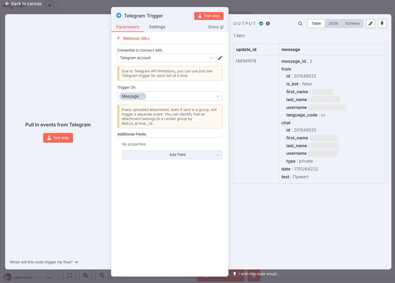 В центре рабочей области появится блок Telegram Trigger с новым триггером.