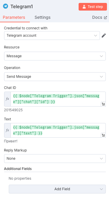Text — укажите {{ $node["Telegram Trigger"].json["message"]["text"] }}.