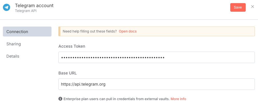 В личном кабинете n8n создайте и настройте учетные данные для подключения к Telegram: