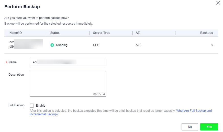 - Choose whether to enable full backup. If full backup is enabled, CBR performs a full backup on every associated server. A full backup requires a larger capacity than an incremental backup.