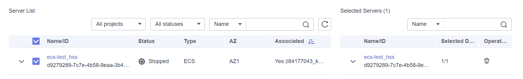 - Click Perform Backup in the Operation column. In the server list, select the server you want to back up. After a server is selected, it is added to the list of selected servers.