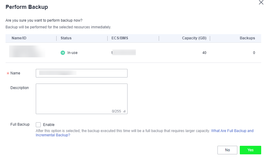 - Choose whether to enable full backup. If full backup is enabled, CBR performs a full backup on every associated disk. A full backup requires a larger capacity than an incremental backup.