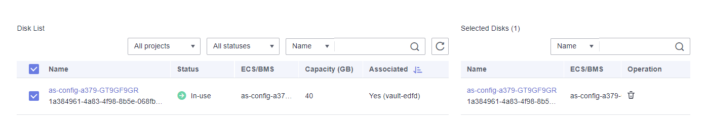 - Click Perform Backup in the Operation column. In the disk list, select the disk you want to back up. After a disk is selected, it is added to the list of selected disks.