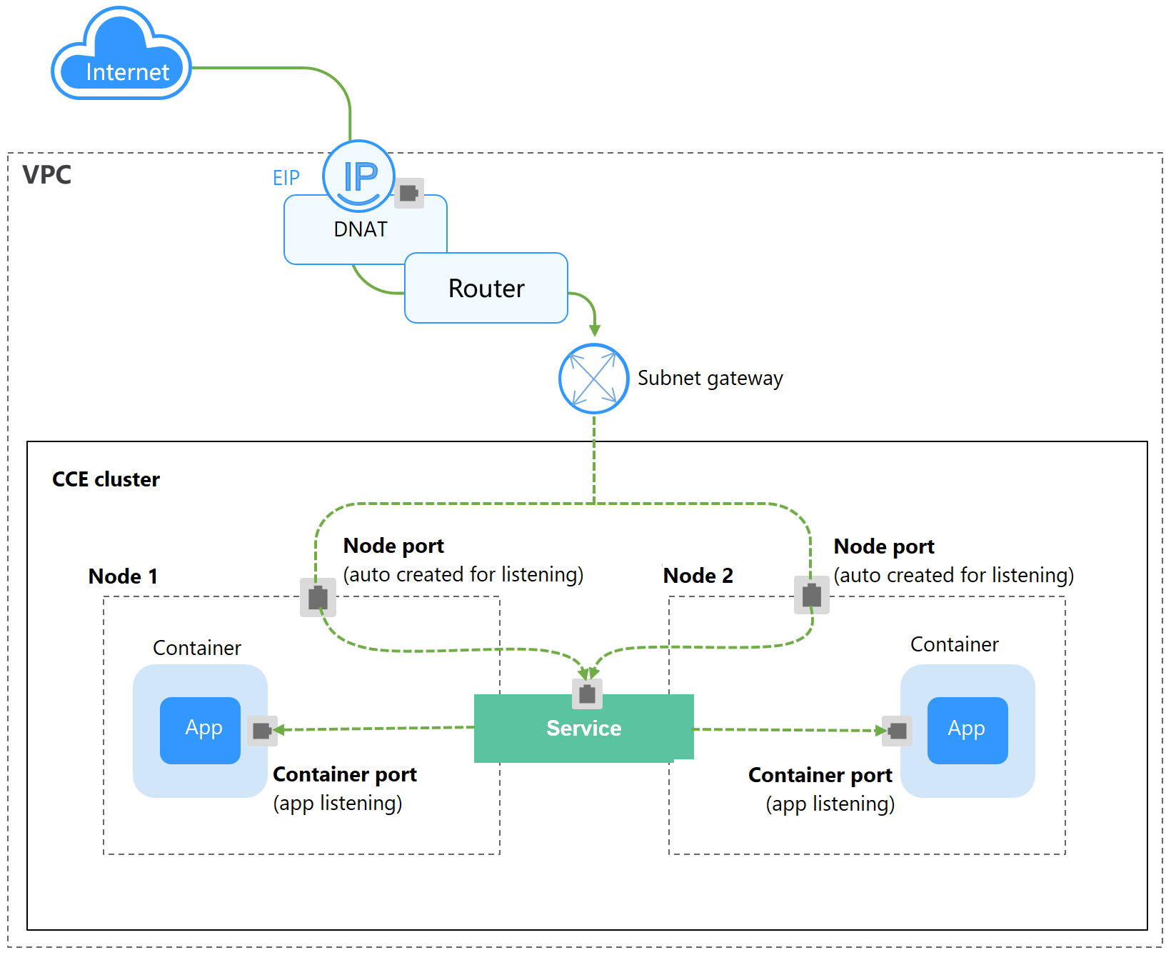 A DNAT Service provides Network Address Translation (NAT) for all nodes in a cluster so that multiple nodes can share an EIP. The access address of a DNAT Service is in the format of <EIP-of-the-NAT-gateway>:<access-port>, for example, 10.117.117.117:80.