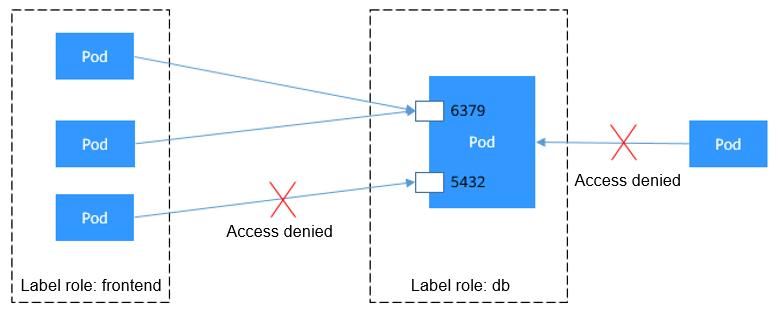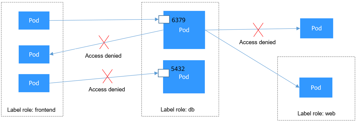 The pod labeled with role=db only permits access to its port 6379 from pods labeled with role=frontend, and this pod can only access the pods labeled with role=web. You can use the same rule to configure both ingress and egress in a network policy. To achieve this, take the following steps: