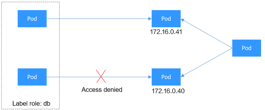 - Scenario 2: Controlled by a preset network policy, a pod can only be accessed by pods with specific labels, while this pod itself can only access specific pods.