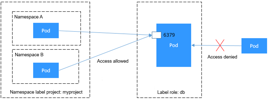 apiVersion: networking.k8s.io/v1kind: NetworkPolicymetadata:name: access-demo2spec:podSelector: # The rule takes effect for pods with the role=db label.matchLabels:role: dbingress: # This is an ingress rule.- from:- namespaceSelector: # Only allows the access of the pods in the namespace labeled with project=myproject.matchLabels:project: myprojectports: # Only TCP can be used to access port 6379.- protocol: TCPport: 6379 - Run the following command to create the network policy defined in the access-demo2.yaml file:kubectl apply -f access-demo2.yaml