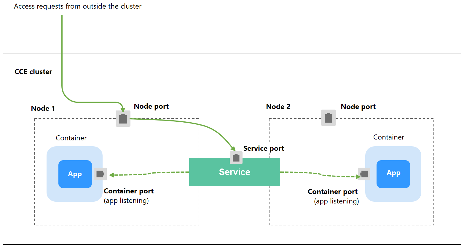 • By default, a NodePort Service is accessed within a VPC. To use an EIP to access a NodePort Service through public networks, bind an EIP to the node in the cluster in advance.