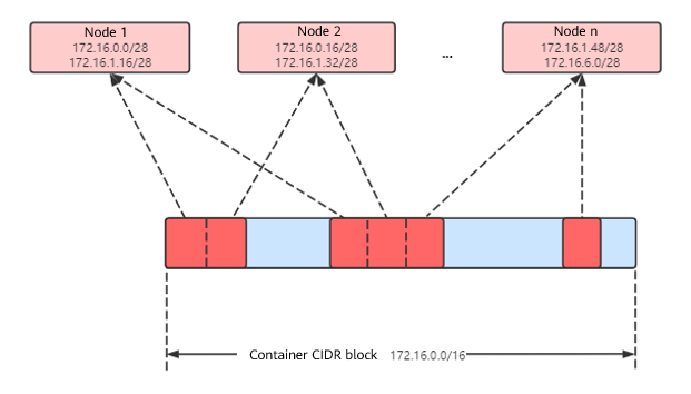 For example, if the container CIDR block is 172.16.0.0/16, the number of IP addresses is 65,536. If the mask of the container CIDR block allocated to each node is 28 (a total of 16 pod IP addresses allocated each time), a maximum of 4,096 (65536/16) nodes can be created. This is an extreme case. If 4,096 nodes are created, a maximum of 16 pods can be created for each node because only a CIDR block with 16 IP addresses is allocated to each node. The number of nodes that can be added to a cluster is also determined by the available IP addresses in the node subnet and the scale of the cluster.