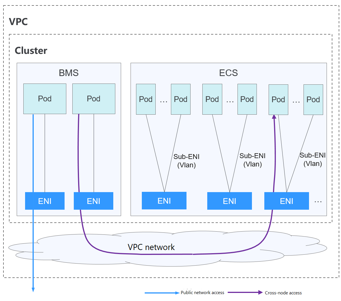 - Traffic for communications between pods on a node, communications between pods on different nodes, and pod access to networks outside a cluster is forwarded through the elastic or supplementary network interfaces of VPC.