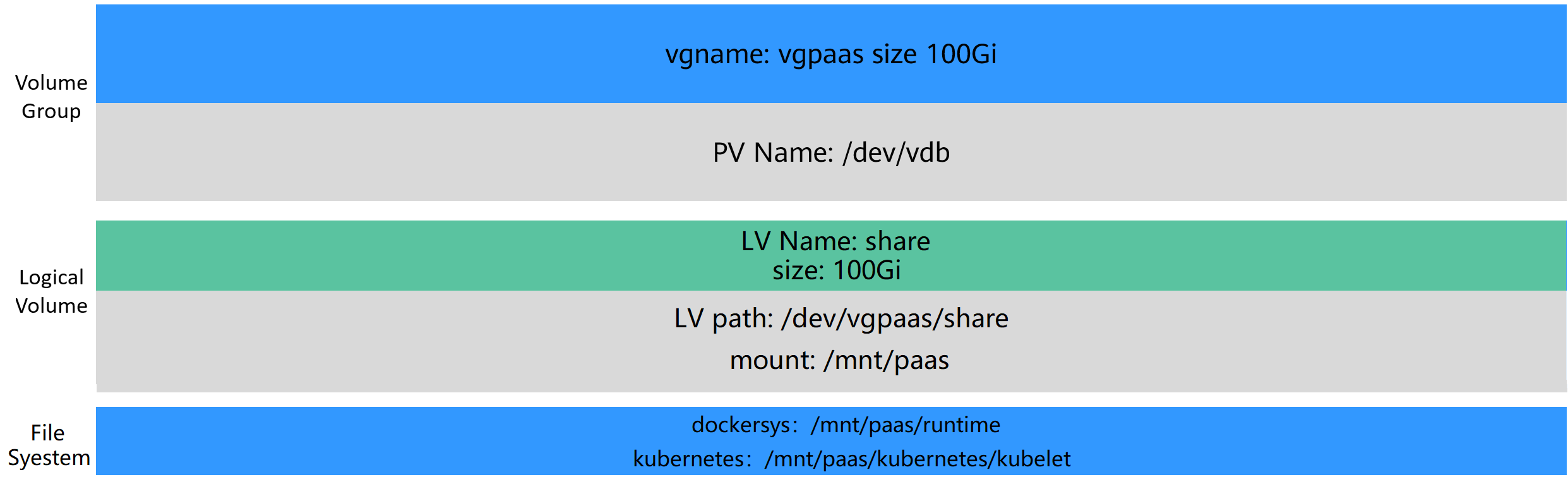 For nodes using a shared data disk, the container storage Rootfs is of the OverlayFS type. After such a node is created, the data disk space (for example, 100 GiB) will not be divided for the container engines, container images, and kubelet components. The data disk is mounted to /mnt/paas, and the storage space is divided using two file systems.
