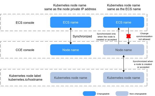 Figure 1 shows the synchronization relationship between ECS names, node names, and Kubernetes node names.