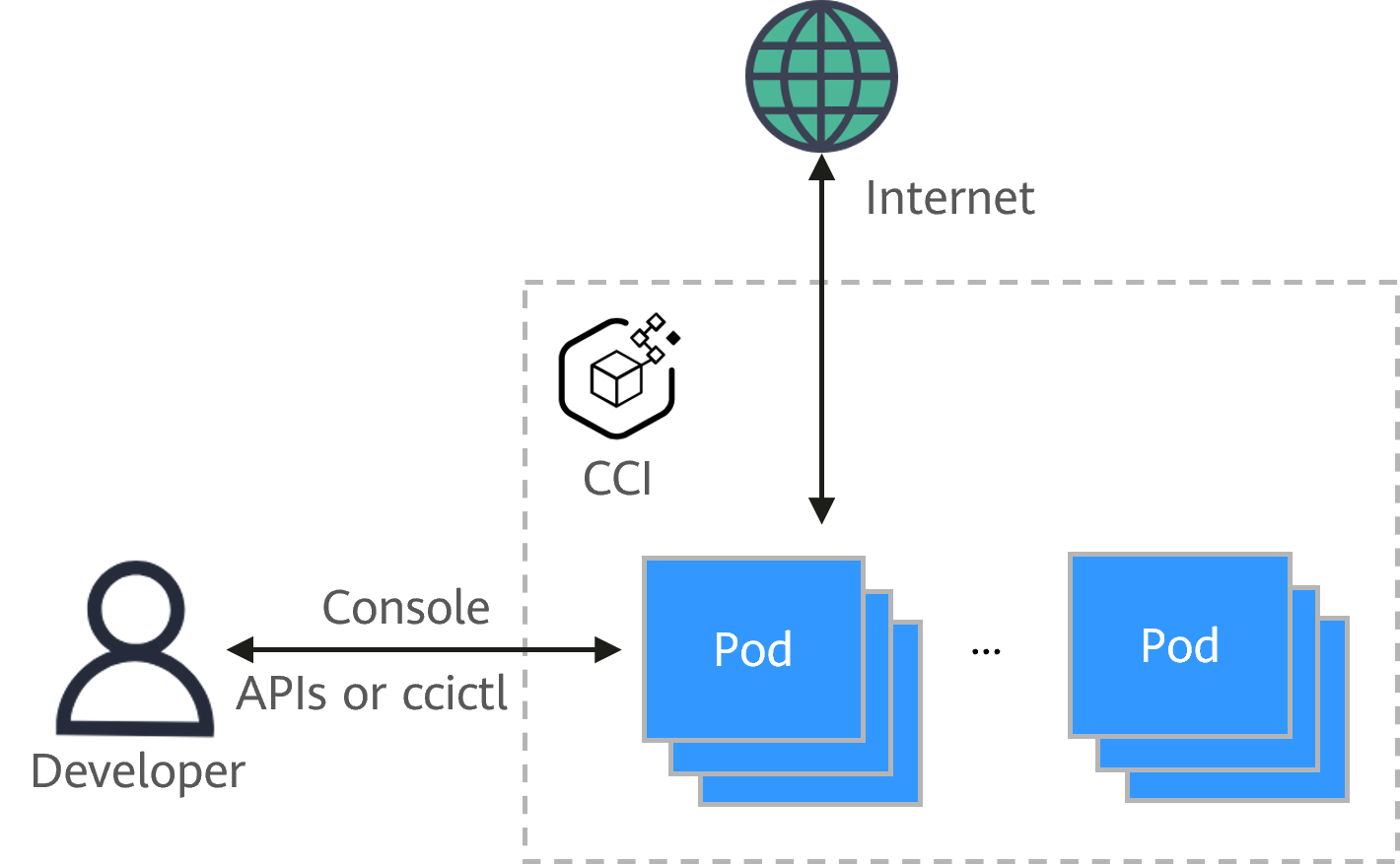 CCI is a serverless container service. CCI's converged resource pool integrates network and storage services, allowing you to easily deploy and run containerized workloads through the console or APIs.