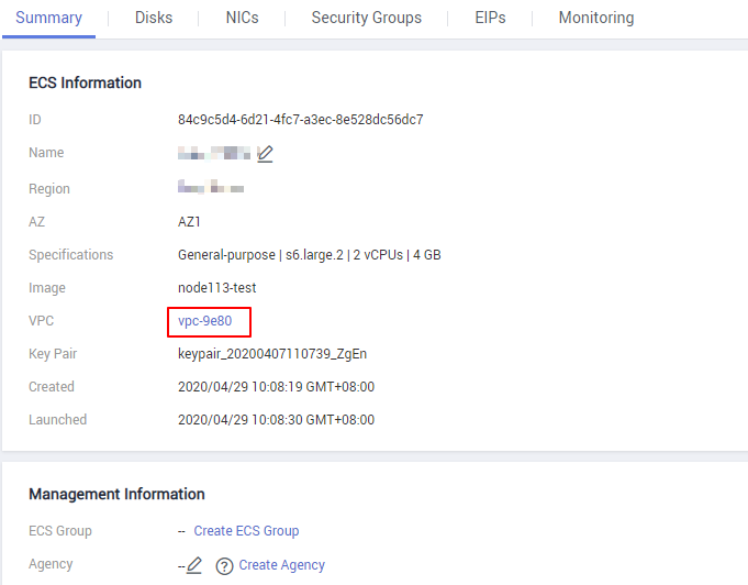 - In the ECS Information area of the Summary tab, click the VPC name. See Figure 2.