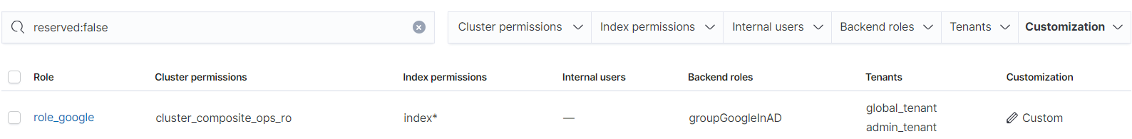 PUT _opendistro/_security/api/securityconfig/config{"dynamic": {"authc": {"basic_internal_auth_domain": {"description": "Authenticate via HTTP Basic against internal users database","http_enabled": true,"transport_enabled": true,"order": 1,"http_authenticator": {"type": "basic","challenge": true},"authentication_backend": {"type": "intern"}},"ldap": {"description": "Authenticate via LDAP or Active Directory","http_enabled": true,"transport_enabled": true,"order": 2,"http_authenticator": {"type": "basic","challenge": false},"authentication_backend": {"type": "ldap","config": {"enable_ssl": false,"enable_start_tls": false,"enable_ssl_client_auth": false,"verify_hostnames": true,"hosts": ["10.0.XXX.XXX:389"],"bind_dn": "CN=adminAD,DC=test,DC=ldap,DC=com","password": "<password>","userbase": "OU=ITDepartment,DC=test,DC=ldap,DC=com","usersearch": "(sAMAccountName={0})","username_attribute": "uid"}}}},"authz": {"roles_from_myldap": {"description": "Authorize via LDAP or Active Directory","http_enabled": true,"transport_enabled": true,"authorization_backend": {"type": "ldap","config": {"enable_ssl": false,"enable_start_tls": false,"enable_ssl_client_auth": false,"verify_hostnames": true,"hosts": ["10.0.XXX.XXX:389"],"bind_dn": "CN=adminAD,DC=test,DC=ldap,DC=com","password": "<password>","rolebase": "OU=groups,DC=test,DC=ldap,DC=com","rolesearch": "(member={0})","userroleattribute": null,"userrolename": "disabled","rolename": "CN","resolve_nested_roles": true,"userbase": "OU=ITDepartment,DC=test,DC=ldap,DC=com","usersearch": "(uid={0})"}}}}}}The parameters in Table 1 need to be modified based on the actual environment.