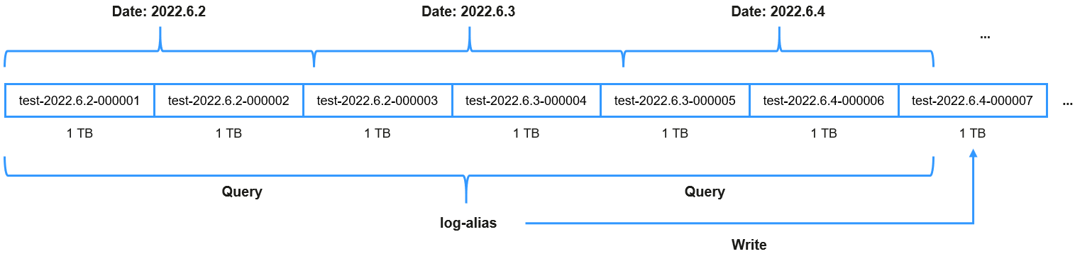 Assume that an index generates approximately 2.4 TB of data each day. The index alias is log-alias. The following figure illustrates the data format in the cluster. During reads, it points to all indexes whose name starts with test. During writes, it points to the latest index.