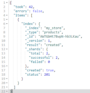 {"took":204,"errors":false,"items":[{"index":{"_index":"my_store","_type":"_doc","_id":"DJQkBIwBbJvUd2769Wi-","_version":1,"result":"created","_shards":{"total":2,"successful":1,"failed":0},"_seq_no":0,"_primary_term":1,"status":201}},{"index":{"_index":"my_store","_type":"_doc","_id":"DZQkBIwBbJvUd2769Wi_","_version":1,"result":"created","_shards":{"total":2,"successful":1,"failed":0},"_seq_no":1,"_primary_term":1,"status":201}}]}