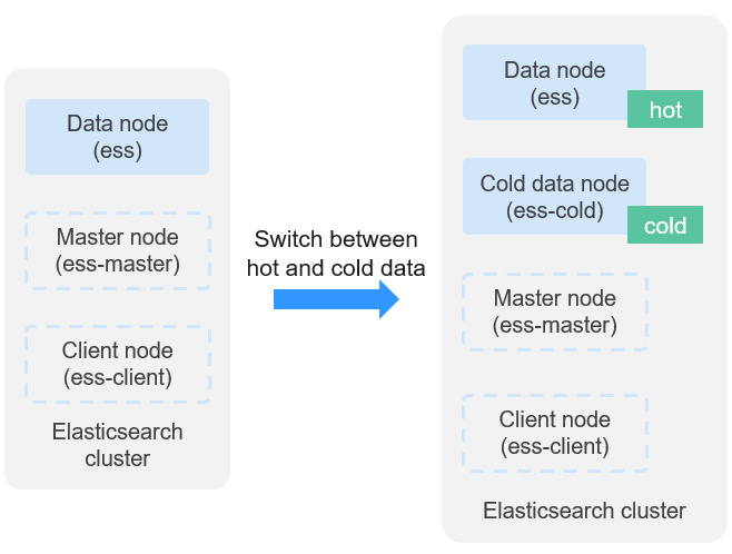 Only clusters that have cold data nodes support switchover between cold and hot data storage. Cold data nodes can be enabled only when a cluster is created. You cannot enable cold data nodes for an existing cluster. If your cluster does not have cold data nodes but you want to cut storage costs, you can try using storage-compute decoupling. For details, see Configuring Storage-Compute Decoupling for an Elasticsearch Cluster.