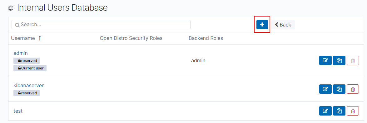 - On the Internal Users Database page, click +. The page for adding a new user is displayed.
