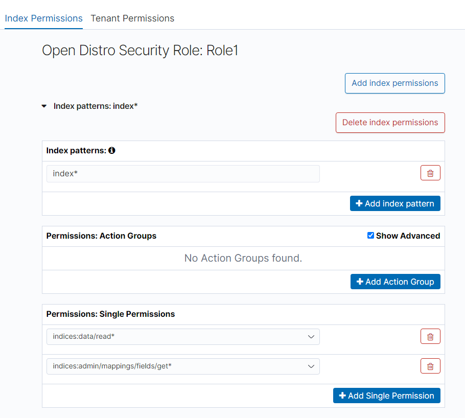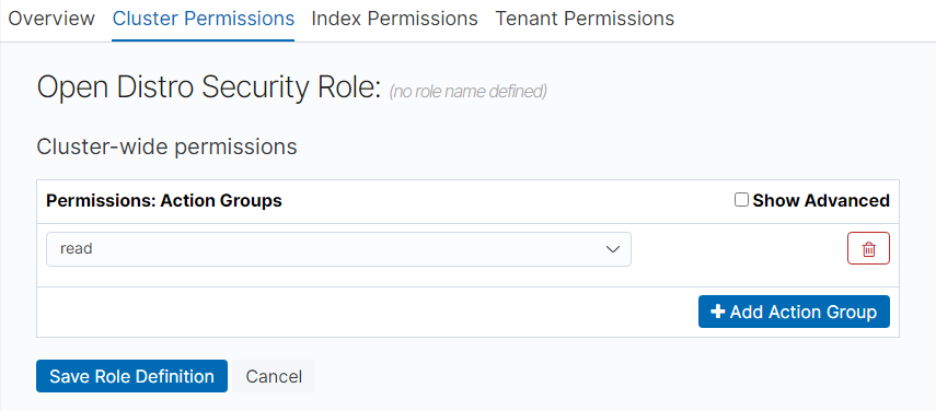 - Permissions: Single Permissions: Select Show Advanced and click Add Single Permission to set more refined permissions for the cluster. For example, indices:data/read indicates a read-only permission on specified indexes.