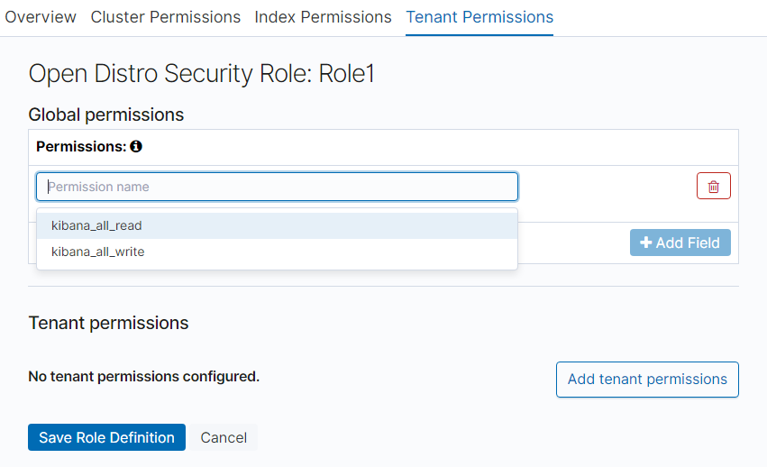 - Global permissions: Click Add Field to set the Kibana read and write permissions of a role, for example, kibana_all_read or kibana_all_write.