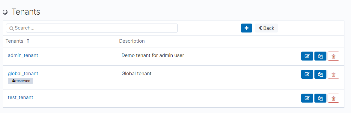 - On the Security page, click Tenants. Click + to create a tenant, for example, test_tenant.