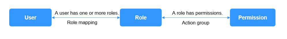 CSS uses the opendistro_security plug-in to provide security cluster capabilities. The opendistro_security plug-in is built based on the RBAC model. RBAC involves three core concepts: user, action, and role. RBAC simplifies the relationship between users and actions, simplifies permission management, and facilitates permission expansion and maintenance. Figure 1 shows the relationship between the three.